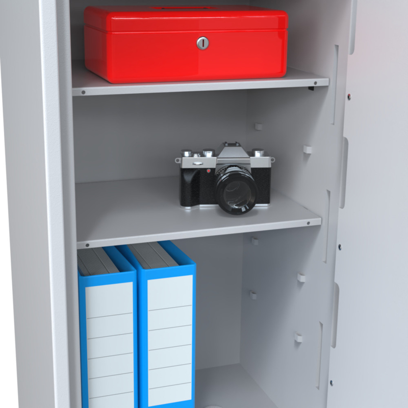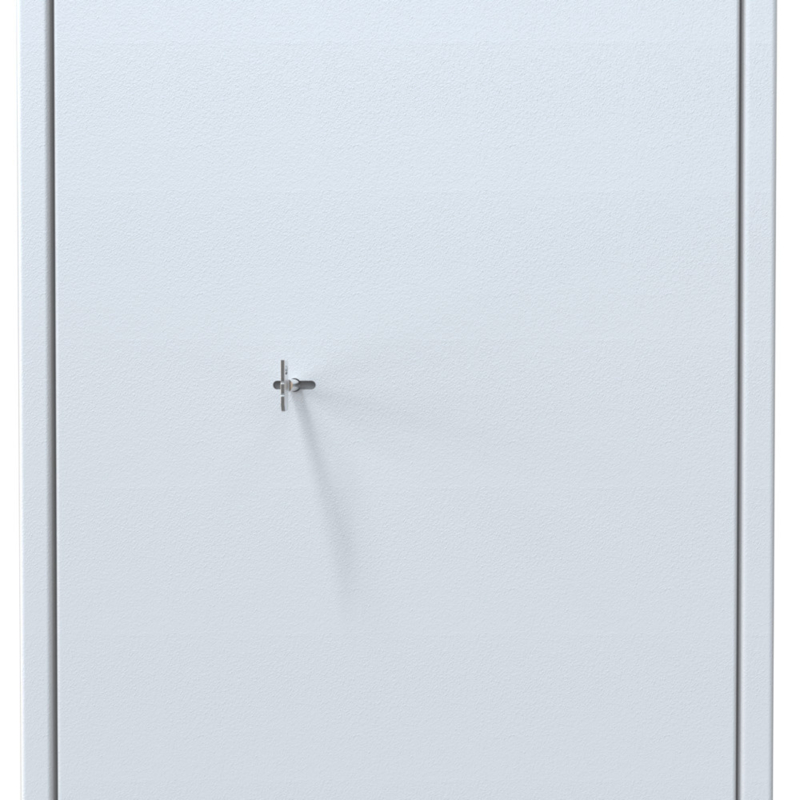 Der Tresor wird mit EN 1300 zertifiziertem Doppelbartschloss (2 Schlüssel) oder EN 1300 zertifiziertem elektronischem Schloss geliefert. Zusatzschlüssel können über das Auswahlmenü bestellt werden. Die Tür öffnet sich bis 90° und verriegelt an drei Seiten.