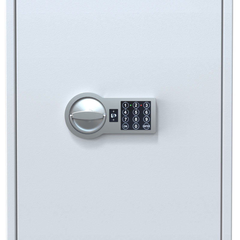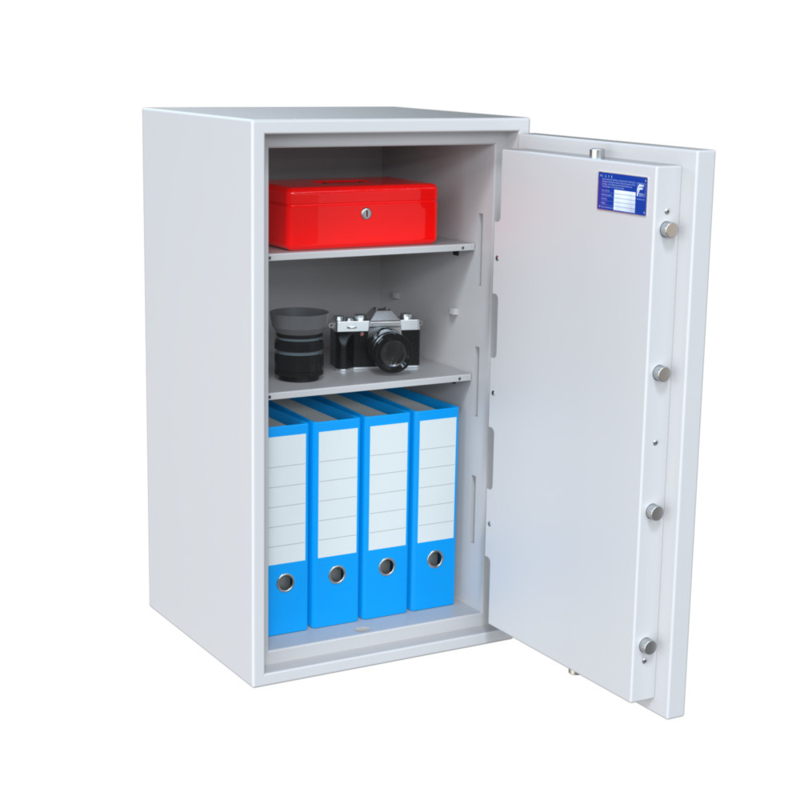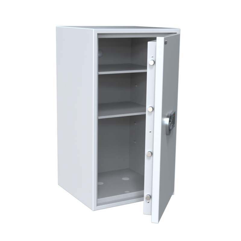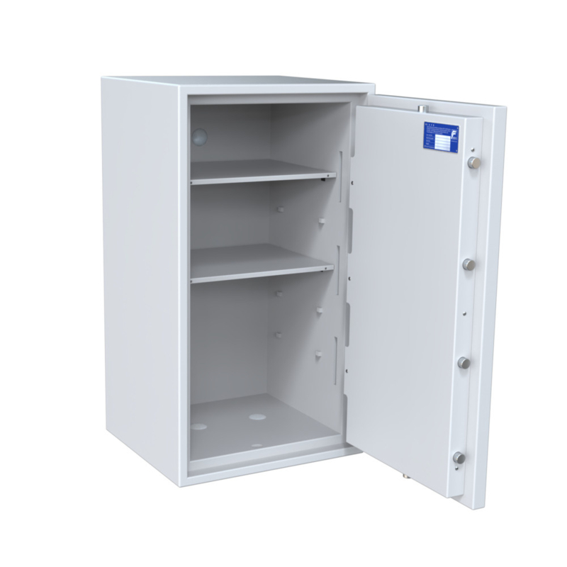 Der Tresor ist mit EN 1300 zertifiziertem Doppelbartschloss (2 Schlüssel) oder EN 1300 zertifiziertem elektronischem Schloss erhältlich. Zusätzliche Schlüssel können über das Auswahlmenü bestellt werden. Andere Modelle der Serie sind ebenfalls mit elektronischem Schloss verfügbar.