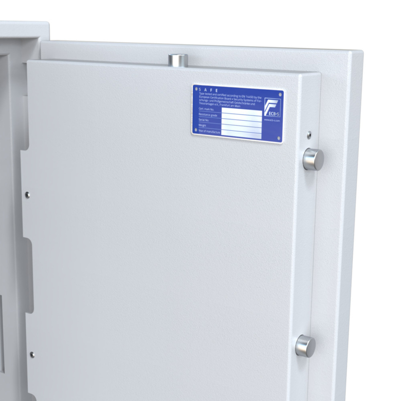 ECB-S zertifiziert nach EN 14450 S2, Wertaufbewahrung: 5.000 € Bargeld, 9.000 € Wertsachen.